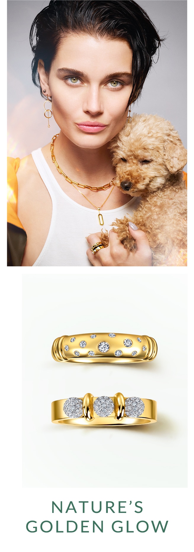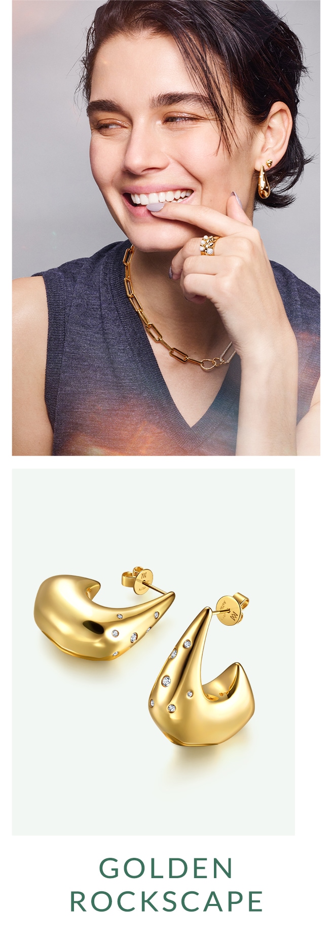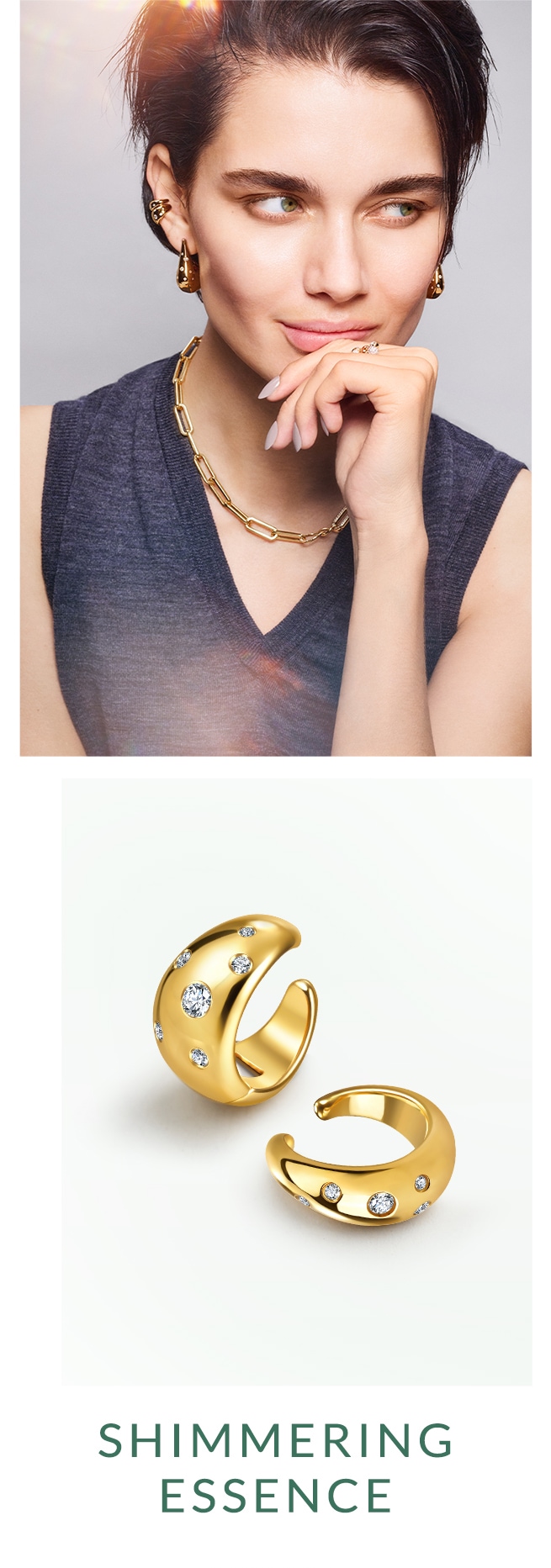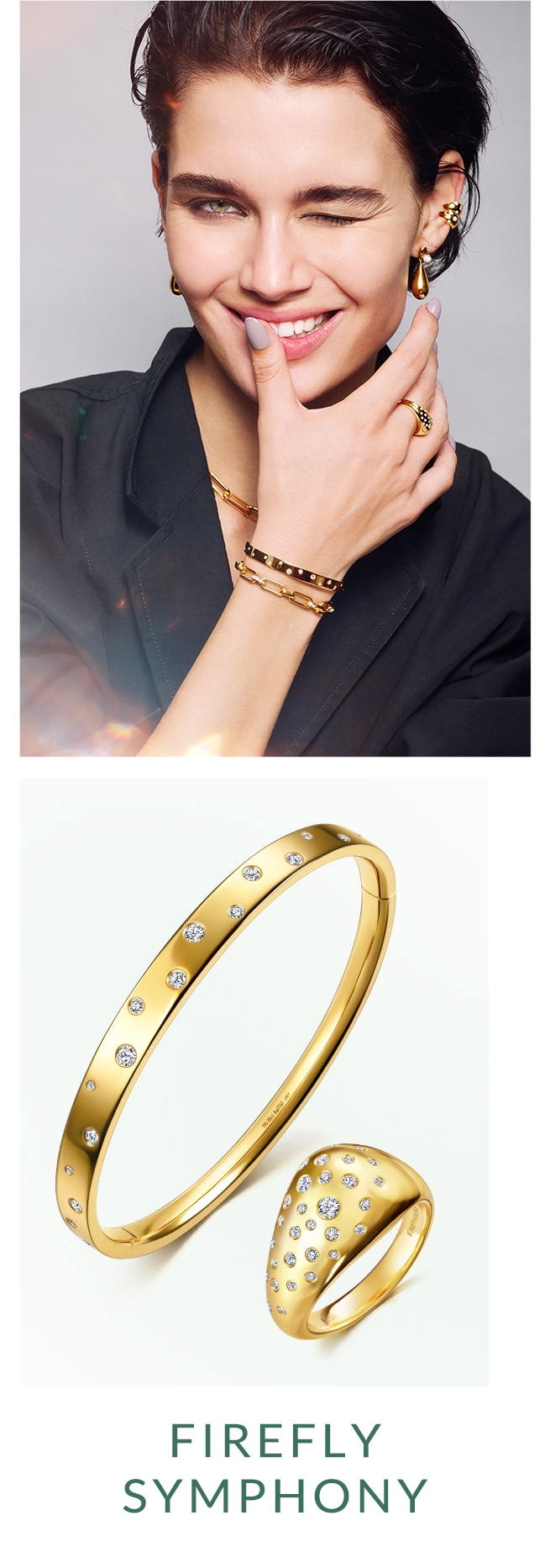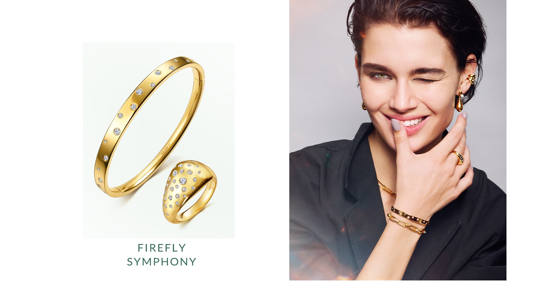 以高抛光18K黃金與精緻包鑲工藝打造,不規則鑲嵌鑽石展現水波與螢火般靈動光影。系列可自由疊戴,於創意混搭中現突破與融合理念。